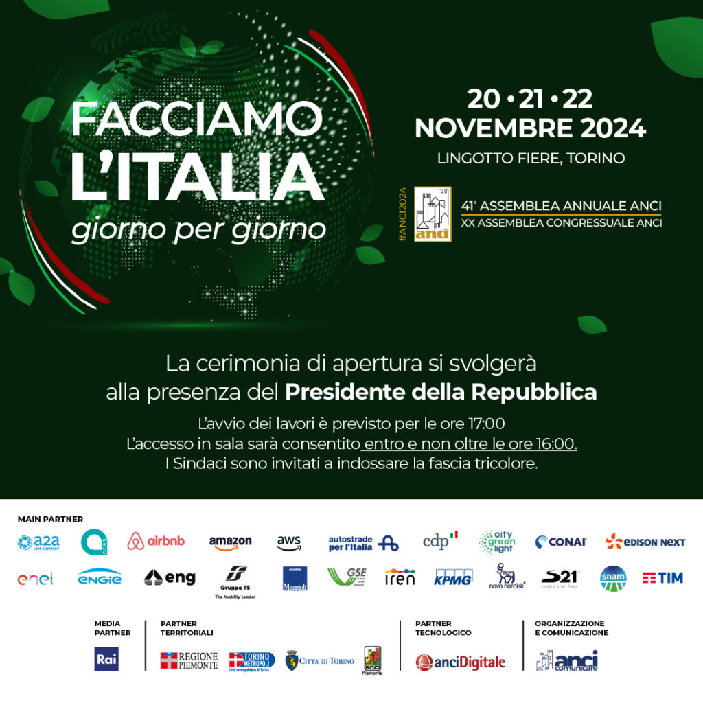 “Facciamo l’Italia, giorno per giorno”. E’ questo il titolo della 41ª Assemblea annuale dell’Anci che quest’anno si svolgerà al Lingotto di Torino dal 20 al 22 novembre prossimi. L’assemblea annuale si aprirà il 20 novembre mattina con la XX assemblea congressuale, chiamata ad eleggere il nuovo presidente dell’Anci. Nel pomeriggio si terrà l’inaugurazione, alla presenza del Presidente della Repubblica.