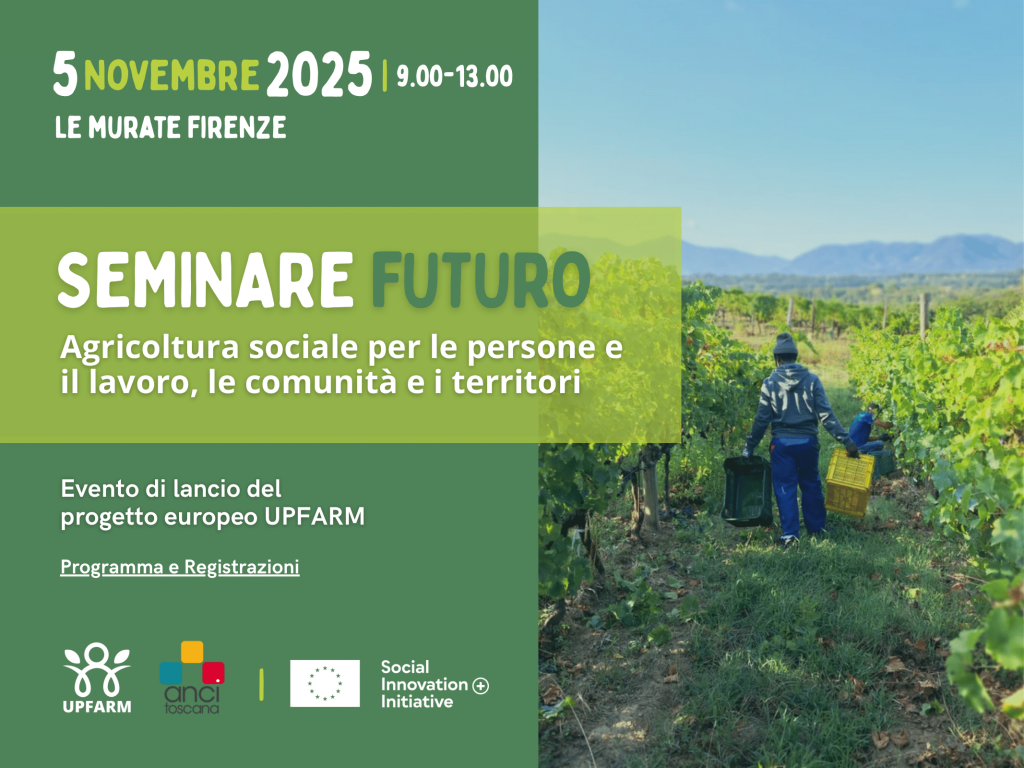 È atteso per mercoledì 5 novembre dalle 9.00 alle Murate di Firenze (Sala Wanda Pasquini – Piazza della Madonna della Neve, 8) “Seminare Futuro”, l’evento di lancio del progetto europeo UPFARM, coordinato da Anci Toscana e finanziato da ESF+ Social Innovation+. Per amministratori, esperti, associazioni, operatori del settore e cittadini, si tratta di un’occasione per approfondire il tema dell’agricoltura sociale come strumento per promuovere l’occupazione inclusiva e sostenibile in Toscana.